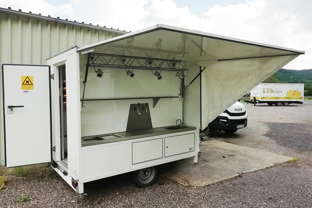 Schankwagen mit vier Zapfhähnen, Kühlung und 360° Theke.